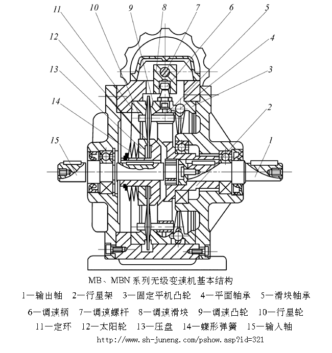 帶錐度的太陽(yáng)輪12和壓盤(pán)13被一組碟形彈簧14壓緊,輸入軸15與太陽(yáng)輪n鍵聯(lián)接,組成壓緊的輸入裝置。一組帶錐度的行星輪10內(nèi)側(cè)夾在壓緊的太陽(yáng)輪與壓盤(pán)之間,外側(cè)夾在帶錐度的定環(huán)11和調(diào)速凸輪9之間,當(dāng)輸入裝置轉(zhuǎn)動(dòng)時(shí),由于定環(huán)和調(diào)速凸輪固定不動(dòng),行星輪就沿定環(huán)作純滾動(dòng),且繞輸入軸作公轉(zhuǎn),通過(guò)行星輪軸及滑塊軸承5而帶動(dòng)行星架2及輸出軸1轉(zhuǎn)l。